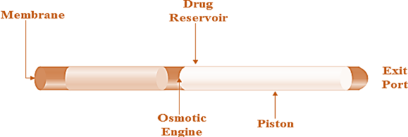 Fig. 4: DUROS technology shows the DUROS technology, depicting the osmotic engine, drug reservoir, piston, and exit port. This system is designed to provide controlled and sustained drug release over an extended period by utilizing osmotic pressure to move the drug through the exit port