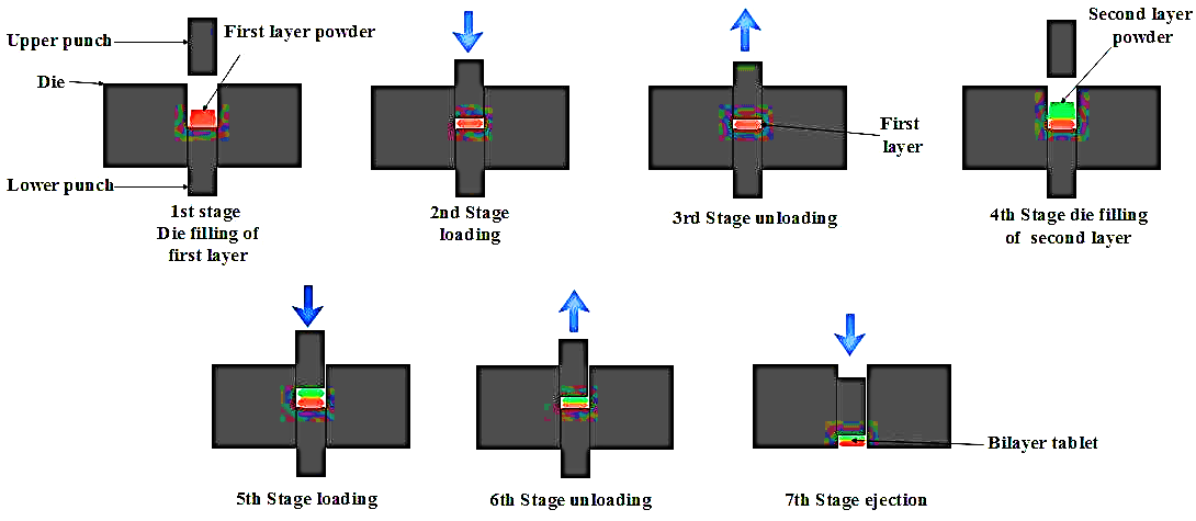 Bilayer tablet production is primarily determined by the physical and/or chemical properties of active pharmaceutical ingredients (APIs) and excipients. The strength and failure of bilayer tablets depend on the material composition of the dosage form. Compression, in all its aspects-plasticity, brittleness, and viscoelasticity-must consider the deformation of plasticity and brittleness of materials under compression. Plasticity refers to a material’s ability to undergo permanent deformation without breaking, allowing it to retain its new shape once the stress is removed. In bilayer tablet manufacturing, plasticity helps the material flow into the die cavity and maintain uniformity in layer thickness, ensuring the tablet’s structural integrity [21]. However, excessive plasticity can lead to excessive deformation, which may affect the tablet's final shape. Brittleness, on the other hand, refers to a material's tendency to break or fracture under stress instead of deforming. Too much brittleness in bilayer tablets can lead to tablet breakage during compression or handling, causing issues like capping or delamination between layers [22]. Viscoelasticity, which combines both viscous (resistance to flow) and elastic (ability to return to original shape) properties, plays a crucial role in the manufacturing of bilayer tablets. During compression, the viscous component ensures that the material flows properly to fill the die cavity, enabling uniform tablet formation, while the elastic component allows some recovery after compression [23]. A material with an optimal viscoelastic profile can deform sufficiently under pressure without cracking or losing structural integrity, which is essential for achieving uniformity and mechanical strength in bilayer tablets. If plastic deformation remains below the bonding limit, it does not negatively affect the process; however, excessive plasticity can lead to undesirable deformation, while excessive elasticity can cause interfacial stress, leading to capping or delamination. Balancing these viscoelastic properties ensures that the material compresses efficiently, maintains strong interlayer adhesion, minimizes brittleness, and supports the structural integrity and therapeutic performance of the final dosage form. Compatibility of viscoelastic properties between both layers is particularly important to avoid interfacial failure and ensure a stable, high-quality bilayer tablet [24, 25]. However, since the breakdown of particles is more considerable in the middle layer of the die compared to the outer layer, it is essential to assess the material properties of a substance before manufacturing bilayer tablets. For a multilayer tablet formulation, volume reduction, mechanical durability, and cohesive strength among each layer are required. They must be highly compact (compressibility-the ability of a material to decrease in volume under pressure; compatibility-the ability of powdered material to convert into tablet form) [26]. To stack tablets, individual layers must be precisely controlled in weight by either optimizing particle size distribution, flow properties, and compression capabilities of the material, or by specifically designing the tablets [27].