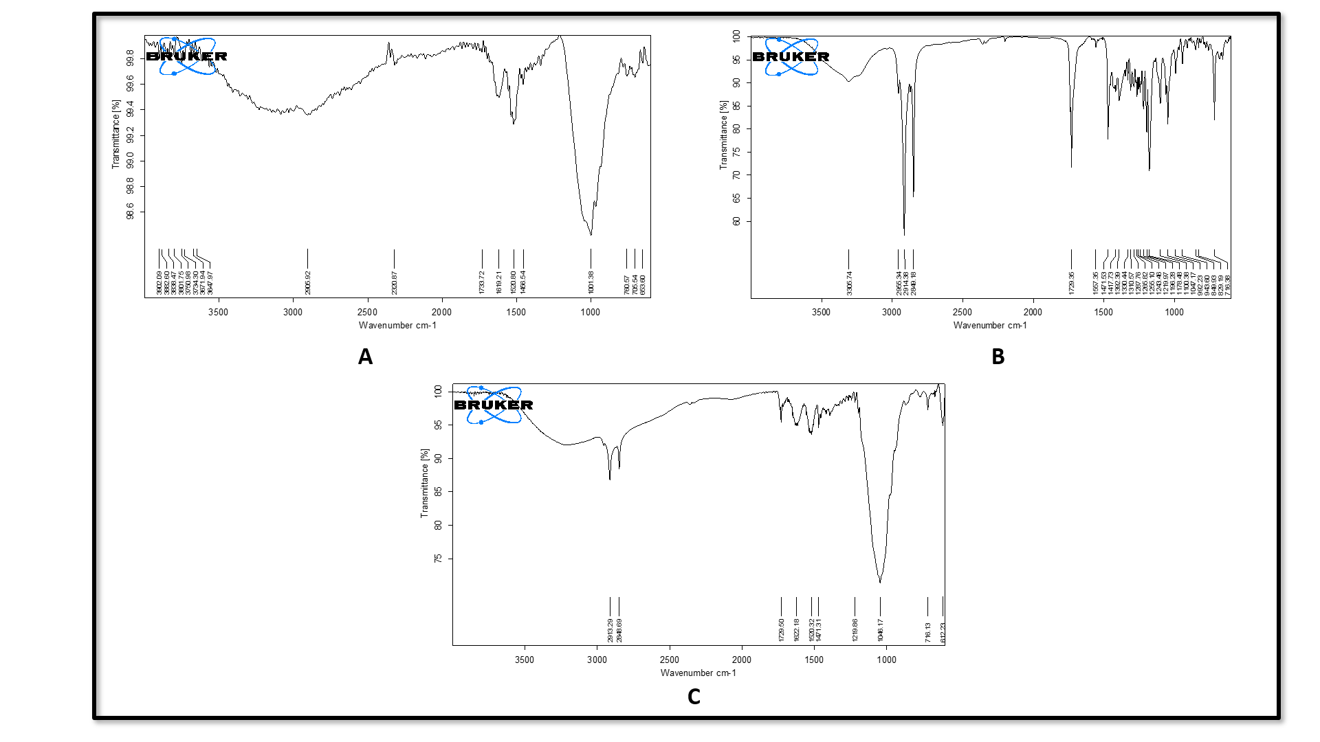 FTIR spectral analysis was conducted using an Alpha Bruker IR Spectrophotometer to evaluate the compatibility between Neomycin sulfate and the lipid carrier. Spectra of the pure drug, lipid, and their physical mixture were recorded and compared with reference standards. Key functional group peaks were identified to assess potential interactions, ensuring that the drug and lipid were compatible or not [8].