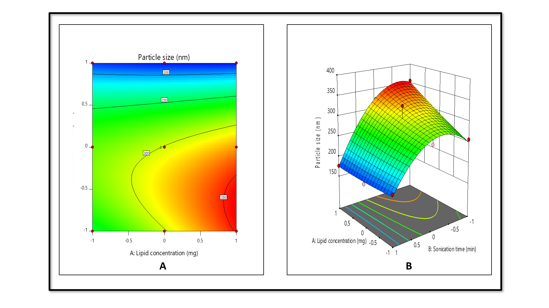 Analysis of the contour (fig. 2A) and 3D surface plots (fig. 2B) indicates that sonication time (B) is the dominant factor affecting particle size. Increasing sonication time initially leads to larger particles, likely due to aggregation, but extended sonication significantly reduces particle size as evidenced by the strong negative linear (-61.85B) and quadratic (-64.86B²) terms, suggesting a non-linear effect where prolonged sonication enhances particle size reduction. In contrast, lipid concentration (A) has a relatively minor impact with a modest positive linear effect (+24.20A) and a small quadratic contribution (+2.79A²), indicating a slight increase in particle size with higher lipid concentrations, possibly due to increased droplet coalescence. Overall, sonication time is the most significant variable for particle size reduction, while lipid concentration has a less significant effect.