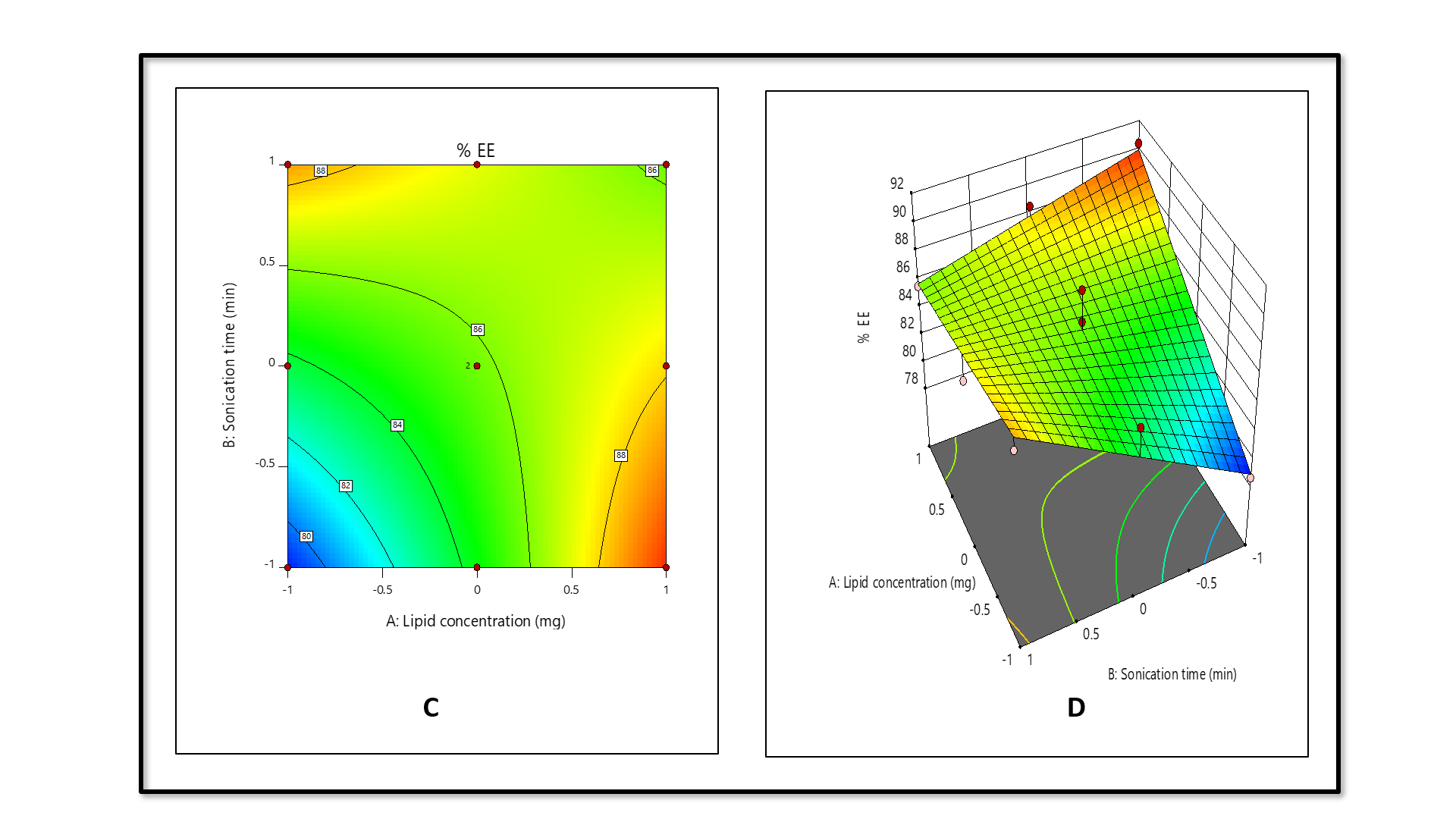 Fig. 3: Contour (C) and 3D surface plot (D) of entrapment efficiency (%) against independent factors