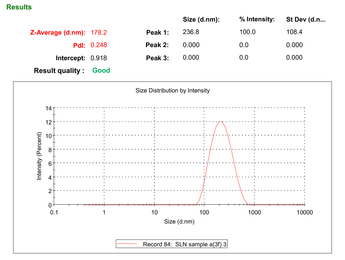The particle size and polydispersity index (PDI) of all the SLNs, including the optimized formulation, were assessed using dynamic light scattering (DLS) with a Malvern Zetasizer. Prior to each measurement, the system was allowed to equilibrate, and the samples were diluted with ultra-pure water [13].