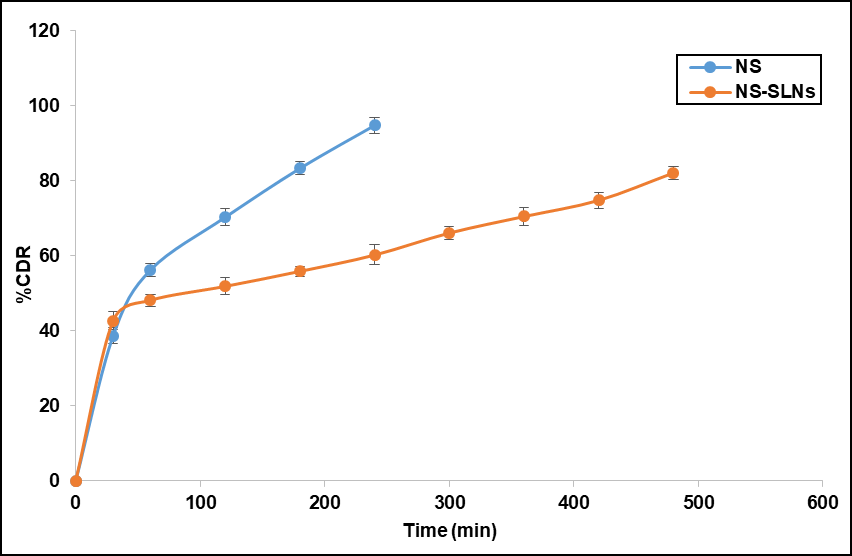 The drug release study was conducted for both free Neomycin sulfate and the optimized formulation (fig. 7). Pure Neomycin sulfate (NS) shows a rapid drug release, up to 94 % within 90 min. This fast release is likely due to the fact that NS is in its free form, not encapsulated or bound to any matrix. The optimized formulation (NS-SLNs) exhibited maximum drug release of 82.11±0.34% throughout 8 h. The release study exhibited a biphasic release pattern, characterized by an initial burst release within the first 50 min, followed by a prolonged and controlled release. The burst release observed at the beginning of the study can be attributed to the rapid diffusion of the drug, Neomycin sulfate, which is loosely associated with the surface or outer layers of SLNs. Research studies claim that for nanoparticulate drug delivery systems, the drug on the outer surface of the particles is more readily available for release. During the early stage of release, the drug molecules can quickly migrate out of the nanoparticle matrix and diffuse through the membrane of the release medium. Following the burst release, the drug release slowed down significantly, entering a sustained release phase. This prolonged release can be attributed to the interaction between the lipid core and the polymeric shell that encapsulates the drug. Moreover, the polymeric coating surrounding the lipid core likely contributes to the prolonged release. The swelling and erosion of the polymeric matrix play a key role in controlling the rate of drug release [29].