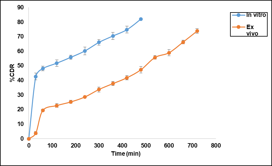 Fig. 9: Comparative study of Ex-vivo drug permeation with in vitro drug release of optimized formulation. Error bars indicate SD values