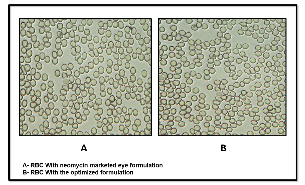 To assess the isotonicity, the optimized formulation was mixed with fresh human blood on a glass slide, smeared, and analyzed using a Biovis particle size analyzer. Commercial eye drops were similarly tested as a reference standard. RBC morphology was microscopically examined for osmotic effects (swelling, bulging of RBCs) by comparing the test sample with the reference formulation [25].