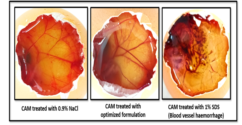 Freshly collected white Leghorn chicken eggs, weighing 50-60 g and not older than 7 days, were selected for the study. Eggs with physical damage or cracks were excluded. The eggs were categorized into 3 groups, each containing 3 eggs. The negative control group received 0.3 ml of normal saline (0.9% NaCl), the test group was treated with 0.3 ml of optimized formulation, and the positive control group was exposed to 0.3 ml of 1% Sodium dodecyl sulphate (1% SDS) to induce potential irritation. All the eggs were incubated at 37±0.5 °C and 58±2% relative humidity, with manual rotation five times daily for about 8 days. After confirming embryonic development by candling, the eggs were positioned large-end up without rotation for a complete 24 h. Test solutions were applied to the CAM, and the irritation effects, such as haemorrhage, coagulation, and vascular lysis, were observed for 5 min [26].