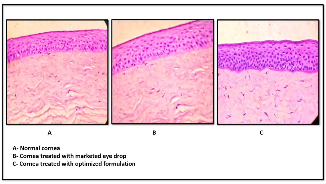 The corneas were carefully removed from the goat eyeballs, following the same procedure used in the ex vivo drug permeation study. The excised corneal tissue was then immersed in normal saline (control), marketed neomycin sulfate eye drops (standard), and the optimized formulation (test) for 8 h. Post-treatment, corneal tissues were cryosectioned into 40 µm transverse slices using a Leica cryotome (Leica, Wetzlar, Germany), dehydrated through an ethanol series, and stained with hematoxylin and eosin. Slides were examined under 40X magnification using an inverted microscope, with histopathological analysis focusing on tissue integrity and morphological changes [27].