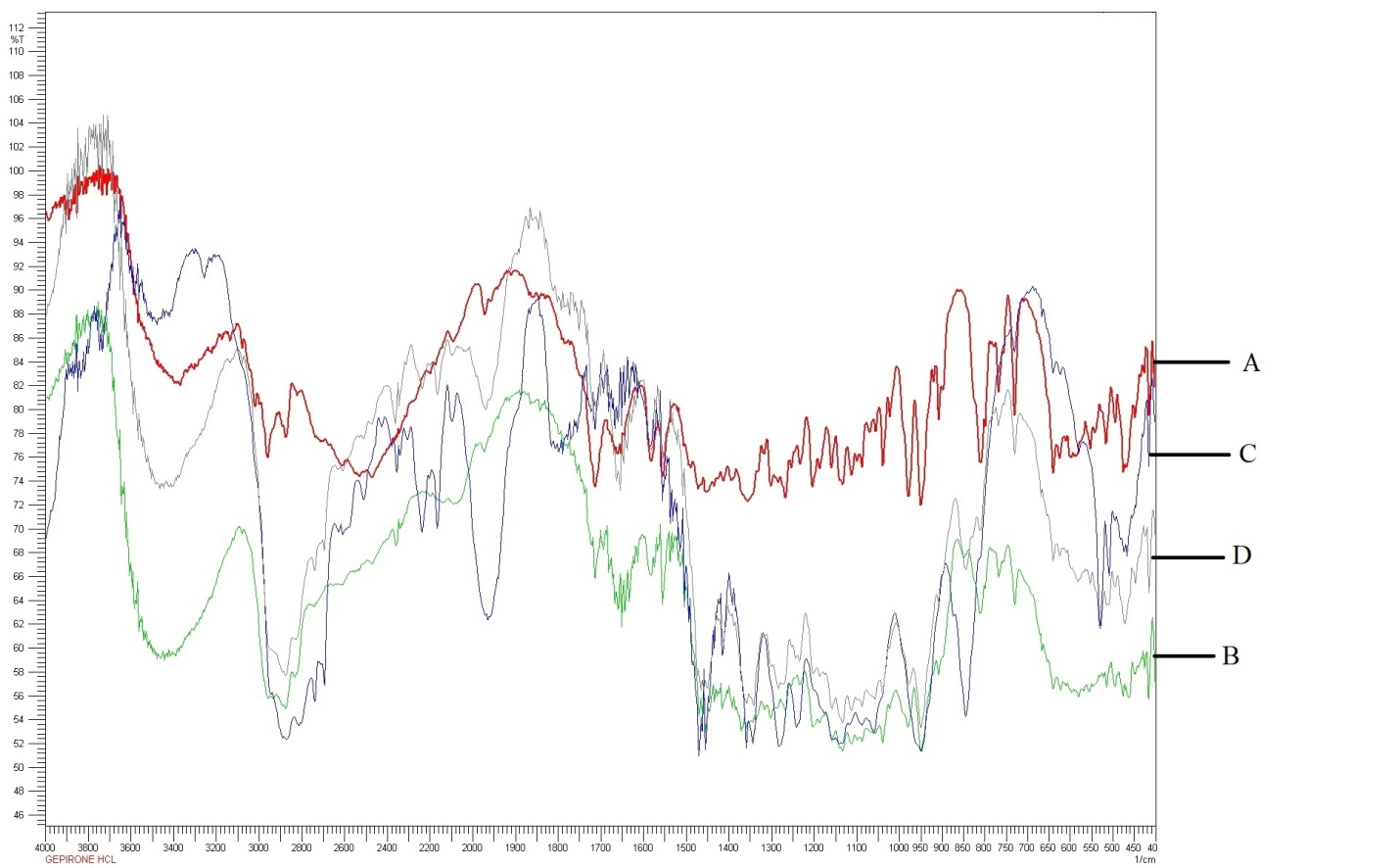 Fig. 1: FT-IR spectra of Gepirone HCl, PM of Gepirone HCl with HPMCK100M (1:1), Gepirone HCl with Polyox WSR N80 (1:1) and Gepirone HCl with HPMCK100M (1:1) and Polyox WSR N80 (1:1:1) for drug polymer compatibility