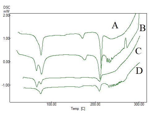 Fig. 2: DSC Thermogram of Gepirone HCl (A), PM of gepirone HCl with HPMCK100M (1:1) (B), Gepirone HCl with Polyox WSR N80 (1:1) (C) and Gepirone HCl with HPMCK100M and Polyox WSR N80 (1:1:1) for drug polymer compatibility