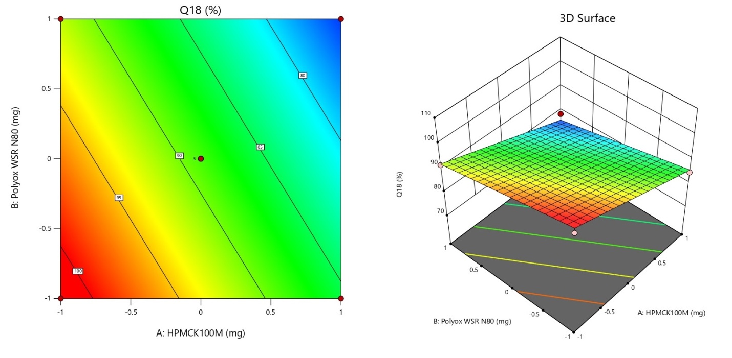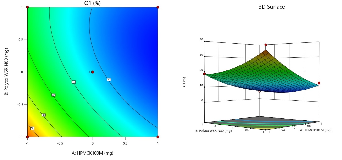 Table 2: summarizes the ANOVA results, highlighting the significance of various factors in our quadratic model. Analysis of the design matrix reveals that the model's F-value and p-value substantiate its significance for Q1, t50, and Q18. For the Q1 response, the analysis revealed that the factors A (HPMC K100M), B (Polyox WSR N80), their interaction (AB), along with their squared terms (A² and B²), were statistically significant (p<0.05, α = 0.05).