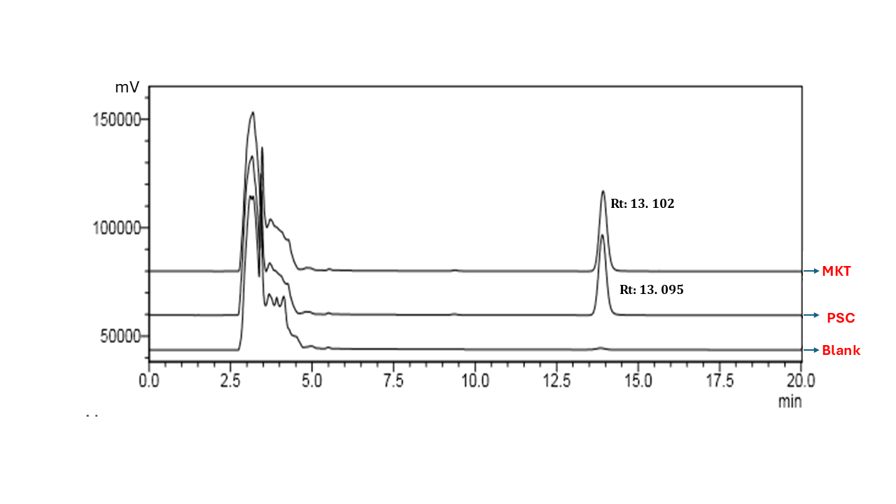 Achieving sufficient separation in the development of chromatographic methods requires establishing specificity, or the HPLC method's ability to accurately quantify the analyte response in the presence of every possible sample constituent. This is assessed by contrasting the analyte's response in complex test mixtures, which may contain blanks, synthetic intermediates, excipients, degradation products, and impurities related to the process, with the analyte's response in a solution that contains the analyte alone [24]. Three different samples were analysed on the HPLC system to assess the specificity of the optimised bioanalytical method: a blank plasma sample, a PSC-spiked plasma sample, and a plasma sample prepared from a commercial PSC formulation (MKT). The resultant chromatograms were critically examined to evaluate any possible interference from endogenous plasma components or formulation excipients at the retention time corresponding to PSC.
