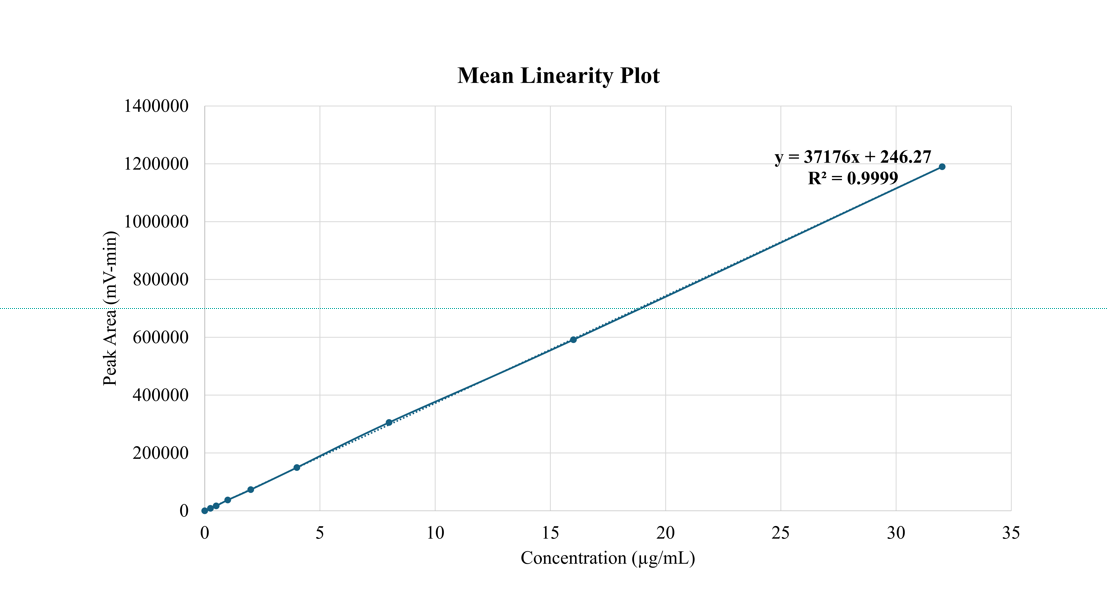 Linearity refers to the capability of the method to generate analytical responses that are directly proportional to the concentration of the analyte within a given sample. Defining the linear dynamic range is a critical requirement, irrespective of the stage of drug development [25]. According to ICH guidelines, linearity of the HPLC method should be confirmed by triplicate injections of at least five concentration levels spanning from 70% to 130% of the nominal concentration [23]. Stock solutions of PSC and the IS, each at a concentration of 1000 μg/ml, were prepared. Fresh working solutions of PSC and IS, at 10 and 100 μg/ml, respectively, were subsequently prepared from the stock solutions. Calibration samples were prepared by spiking blank plasma with defined volumes of PSC to yield final concentrations ranging from 0.25 to 32 μg/ml. The clinically relevant plasma concentrations of posaconazole>0.7 mg/l for prophylaxis and>1.0–1.25 mg/l for treatment of IFI are fully encompassed and exceeded by the validated linear range of 0.25–32 µg/ml [26]. The calibration curve was established by plotting PSC concentrations against the corresponding peak area. The coefficient of regression (R²) value (0.99) obtained from linear regression analysis indicated the extent to which the data conformed to the linear model [27].