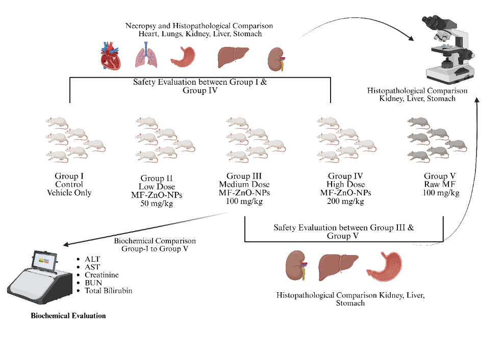 Fig. 1: The experimental design involves a comparative toxicity evaluation of miltefosine-loaded zinc oxide nanoparticles (MF-ZnO-NPs) in wistar rats. Five groups were studied: Group I received only the vehicle (control), while Groups II, III, and IV received increasing oral doses of MF-ZnO-NPs at 50 mg/kg (low dose), 100 mg/kg (medium dose), and 200 mg/kg (high dose), respectively. Group V received raw miltefosine at a dose of 100 mg/kg to serve as a comparator for unformulated drug toxicity. Biochemical evaluations were conducted for Groups I to V to assess liver and kidney function using ALT, AST, creatinine, urea (BUN), and total bilirubin levels. Safety assessments were made between Group I and Group IV to evaluate the effects of the highest nanoparticle dose, and between Group III and Group V to compare the safety of the nanoparticle formulation with raw miltefosine. Histopathological examinations were performed post-necropsy. Group I and IV were compared across the heart, lungs, liver, kidney, and stomach, whereas Group III and V were compared with focus on kidney, liver, and stomach to determine structural and cellular alterations induced by the treatments. Publication License available on: https://biorender.com/gq3c44h
