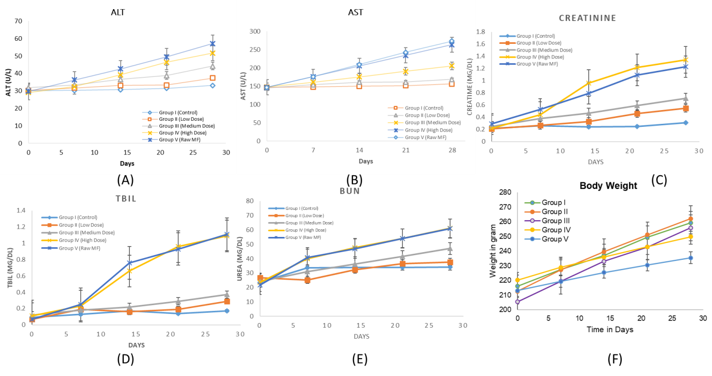 Fig. 2: Illustrates the temporal progression of serum biochemical and behavioral parameters over a 28 d period following oral administration of free miltefosine and miltefosine-loaded mesoporous ZnO nanoparticles (MF-ZnO-NPs NPs) in wistar rats. (A) shows ALT levels, while (B) represents AST levels, both of which increased in a dose-dependent manner, with the highest elevations observed in Group IV (High Dose MF-ZnO-NPs) and Group V (Raw Miltefosine), indicating significant hepatic stress. (C) depicts serum creatinine concentrations, which also rose notably in the high-dose and raw drug groups, suggesting impaired renal function. Similarly, (D) (total bilirubin) and (E) (BUN) further support the presence of hepatobiliary and renal toxicity at higher doses, whereas Groups II (Low Dose) and III (Medium Dose) maintained relatively stable biochemical values, indicating better systemic tolerability. Panel F presents body weight trends, where consistent weight gain was observed in Groups I to III, while Groups IV and V exhibited blunted growth trajectories, aligning with the biochemical evidence of toxicity. Collectively, these findings confirm a dose-dependent toxicity profile and highlight the improved safety of MF-ZnO-NPs formulations at lower doses. Data are presented as mean±standard deviation (n = 6 per group)