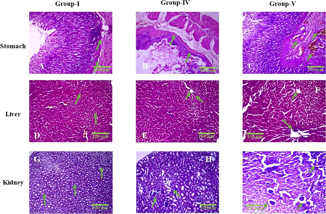 Fig. 3: Representative histopathological sections of the stomach, liver, and kidney from Group I (Control), Group IV (High Dose MF-ZnO-NPs), and Group V (Raw Miltefosine), stained with hematoxylin and eosin (HandE) and observed under 400× magnification. All images include 100 µm scale bars for reference. In the stomach sections (A–C), Group I displays intact mucosal epithelium and submucosa with no pathological changes (green arrows indicate preserved epithelial lining), whereas Group IV shows mild to moderate epithelial disruption and submucosal edema (B; green arrows mark mucosal folding and thinning), and Group V reveals severe epithelial erosion and dense inflammatory infiltration (C; green arrows indicate ulcerated regions and infiltrating leukocytes), corresponding to semi-quantitative inflammation scores of 0, 1–2, and 3, respectively. In the liver sections (D–F), Group I exhibits normal hepatic cords and central veins (green arrows in D), Group IV presents moderate hepatocellular degeneration and sinusoidal dilation (E; green arrows highlight swollen sinusoids), and Group V shows extensive centrilobular necrosis, sinusoidal congestion, and lymphocytic infiltration (F; green arrows indicate necrotic foci and disrupted hepatic cords), corresponding to necrosis scores of 0, 2, and 3. In the kidney sections (G–I), Group I demonstrates intact glomeruli and tubular structures (green arrows in G), Group IV exhibits moderate tubular degeneration and interstitial inflammation (H; green arrows highlight tubular dilation and interstitial cell infiltration), and Group V shows severe peri-glomerular inflammation, glomerular hypercellularity, and loss of tubular integrity (I; green arrows indicate pathological glomerular changes), with semi-quantitative scores ranging from 0 to 3. These histological findings visually support the graded tissue-level toxicity observed across treatment groups and reinforce the protective effect of MF-ZnO-NPs compared to raw miltefosine