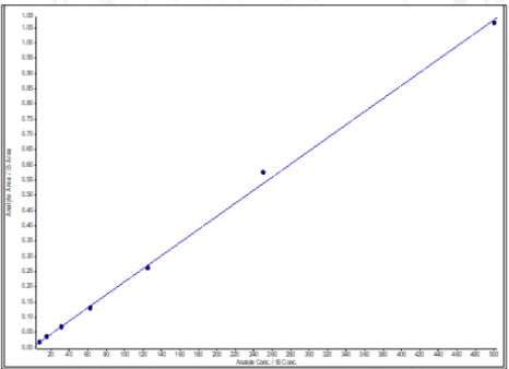 Fig. 4: Calibration curve of Miltefosine with LLOD 1.35 ng/ml; LLOQ 3.81 ng/ml; LQC 23.43 ng/ml; MQC 187.5 ng/ml; and HQC 375.00 ng/ml. (r2=0.999)