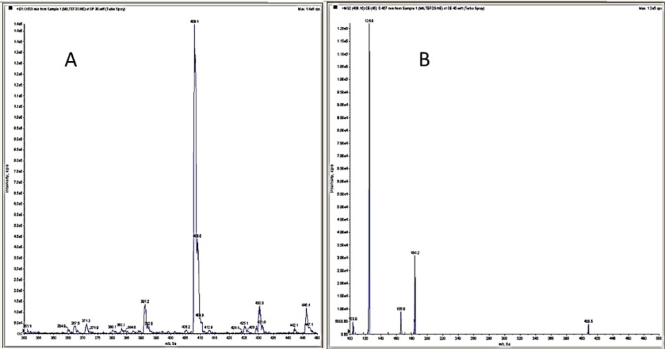 Fig. 5: (A) Miltefosine standard (Q1 scan) parent ion 408.1; (B) Miltefosine standard (MS2 scan) product ion 124.9 (Q1/Q3 transitions of 408.1/124.9 and 268.2/116.2)