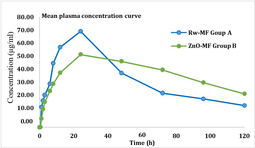 The pharmacokinetic evaluation revealed a distinct improvement in the oral bioavailability and pharmacokinetic behavior of miltefosine when delivered via mesoporous ZnO nanoparticles (MF-ZnO-NPs) compared to the conventional free drug shown in table 7. Although both formulations exhibited the same Tmax of 24 h, indicating a similar absorption rate, significant differences were observed in the extent and duration of systemic exposure. The MF-ZnO-NPs group (Group B) achieved a higher AUC0–t (4820.5±160.5 h·µg/ml) and AUC0–inf (7375.9±609.56 h·µg/ml) compared to the free miltefosine group (Group A) with AUC0–t of 4229.4±125.14 and AUC0–inf of 5539.7±240.99, reflecting a marked enhancement in overall drug exposure due to nanoparticle encapsulation. The relative bioavailability (%RB) of the MF-ZnO-NPs formulation was calculated at 133.14%, confirming superior systemic availability compared to the raw drug. Moreover, the MF-ZnO-NPs group exhibited a reduced elimination rate constant (Kel= 0.0096±0.0013 hr⁻¹) and a prolonged half-life (T½= 73.84±11.32 h) relative to the free drug (Kel= 0.0122±0.0012 hr⁻¹, T½= 57.29±5.61 h), indicating a sustained systemic retention and slower clearance. Interestingly, while the Cmax of the raw miltefosine group (69.49±1.18 µg/ml) was slightly higher than that of the MF-ZnO-NPs group (59.76±7.36 µg/ml), this was offset by the extended exposure duration and improved bioavailability profile of the nanoparticle formulation. Collectively, these findings support the premise that MF-ZnO-NPs nanoparticles not only enhance the oral bioavailability of miltefosine but also modulate its pharmacokinetic profile in a manner that may contribute to prolonged therapeutic activity and improved safety.