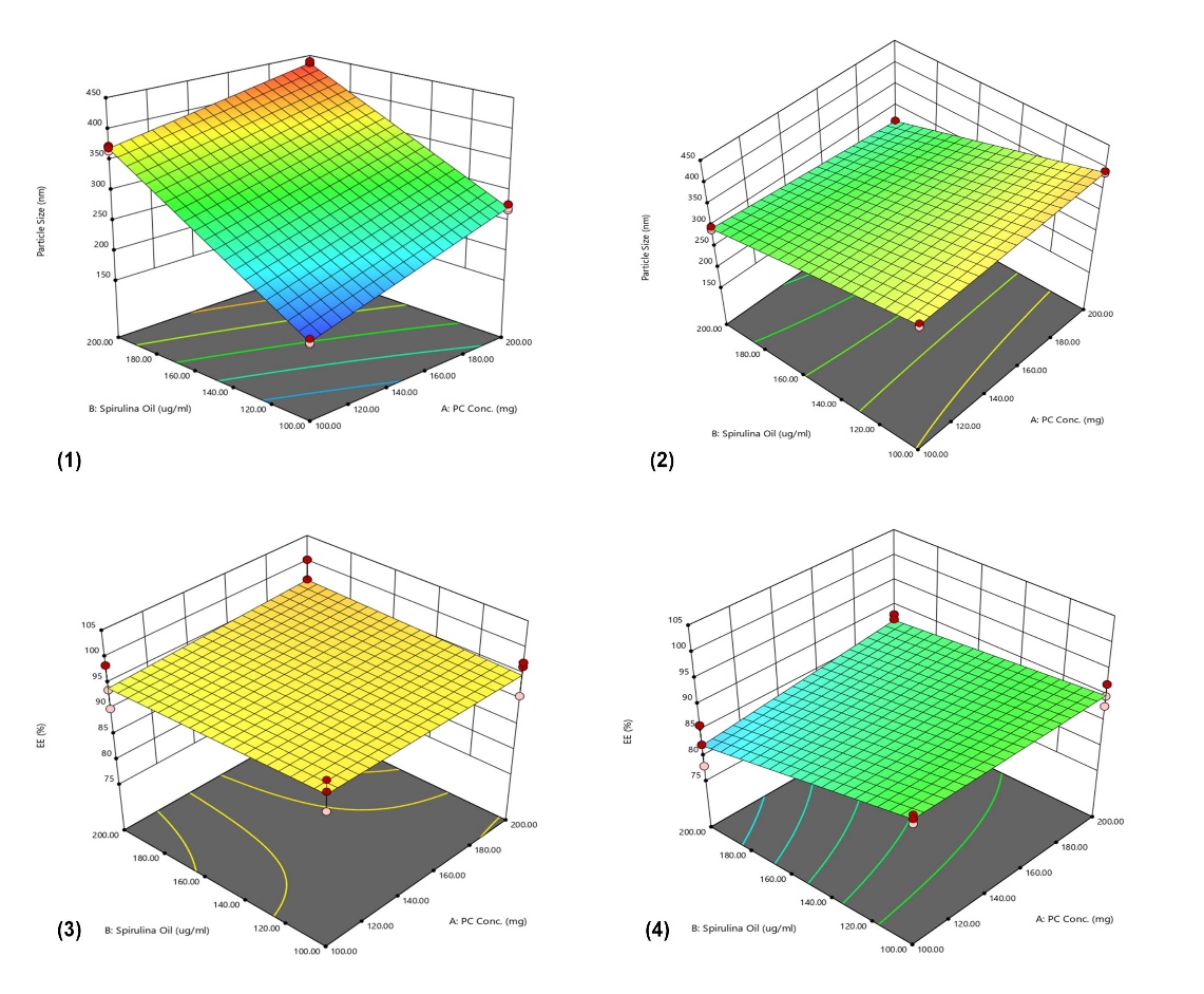 The selected ranges for phosphatidylcholine (100–200 mg) and Spirulina oil (100–200 μg/ml) were based on preliminary optimization trials, which demonstrated stable vesicle formation, nanoscale particle size, and high drug entrapment within these levels. The hydration medium (distilled water vs. water–ethanol mixture) was included as a categorical factor to assess its influence on vesicle characteristics. These factor ranges are also in line with previous emulsome and lipid nanocarrier studies reported in the literature [16, 26-28].