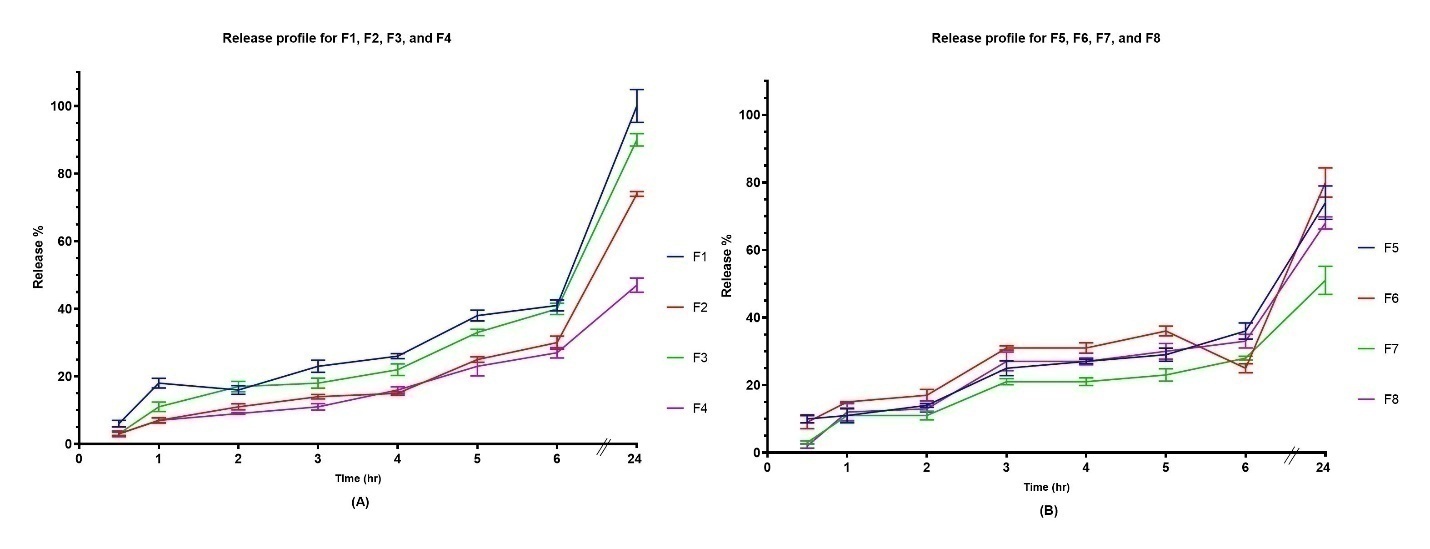Samples of 2 ml were withdrawn from the released media at preselected time points of 0.5, 1, 2, 3, 4, 5, 6, and 24 h. After collection, the samples were filtered and assayed using a spectrophotometric method at a wavelength of λmax 248 nm via UV spectroscopy (Shimadzu-1650 PC double beam, Japan). The assays were carried out in triplicate, and the results are reported as mean values±standard deviations [35].