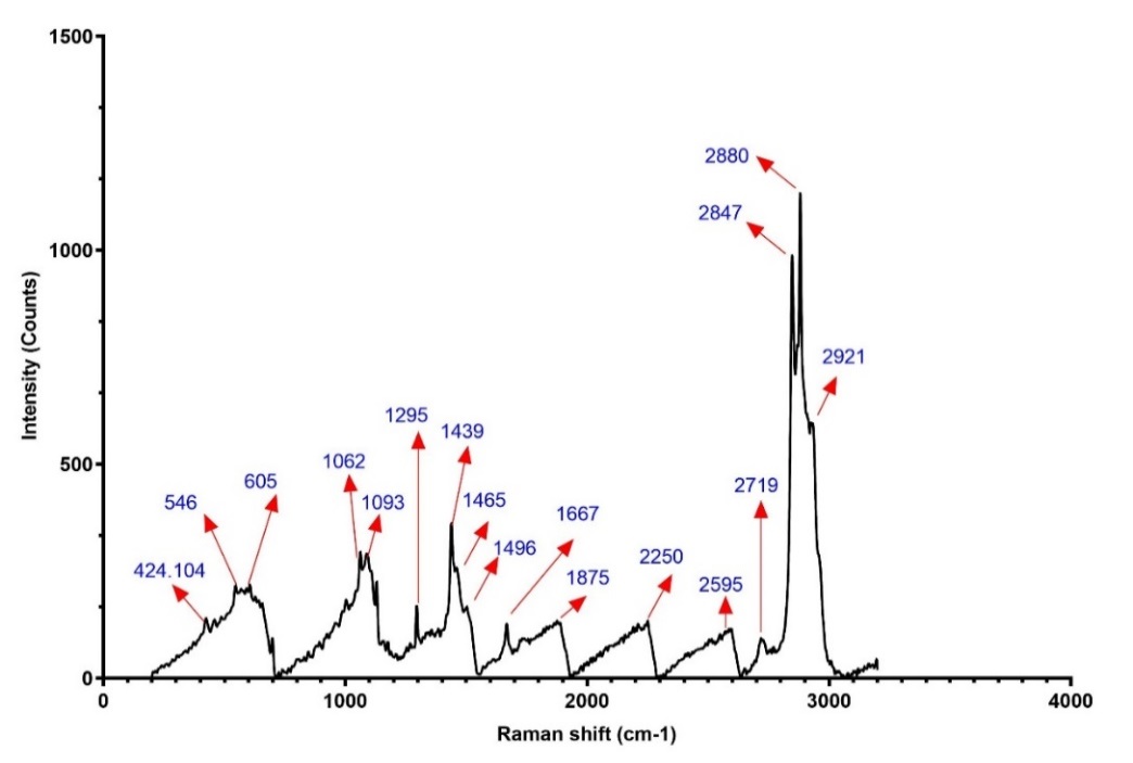 To explore potential interactions between atorvastatin and other components within the optimized Spirusomes formulation, a Raman spectrometer was employed. Raman spectra were acquired for the optimized Spirusomes using Horiba Lab RAM HR Evolution (Edison, NJ, USA). The analysis was conducted at 25 °C, utilizing a 532 nm He-Cd laser line with grating 1800 (450-850 nm) and a 5% neutral density filter. The acquisition time was set at 20 sec without any delay. Measurements were carried out within the wavelength range of 200 to 3200 cm-1 to discern potential alterations, shifts in peaks, or broadening in the spectra [39].