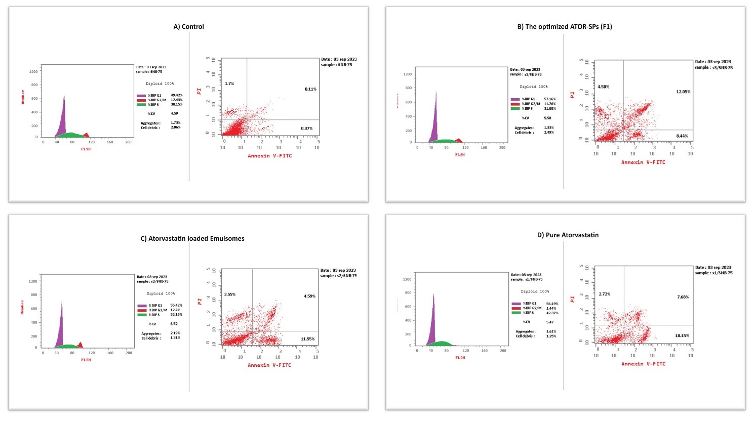 Methods: Eight atorvastatin-loaded Spirusome formulae were prepared and assessed concerning vesicle size, charge, entrapment efficiency, and in vitro release profile. F1, containing 10 mg of atorvastatin, 100 mg of lecithin, and 1 mg of Spirulina oil, achieved a desirability score of 0.859 based on Design Expert® analysis. Raman spectroscopy was used to test for any possible drug interactions. In vitro cytotoxicity studies on SNB-75 human brain cancer cells were carried out to evaluate the anticancer efficacy of the optimized Spirusomes. In vivo pharmacokinetic studies on albino rats were used to examine the drug’s pharmacokinetic profile in plasma and brain tissues after intranasal and oral administration.