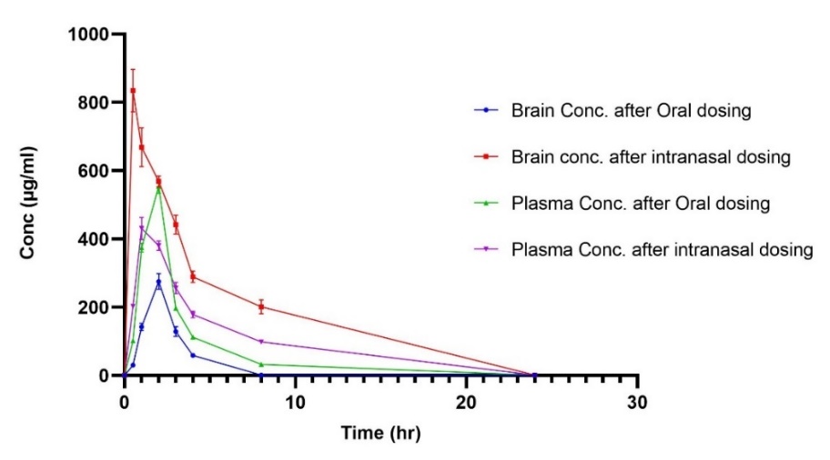 The BTI was determined at two points: (1) the Cmax and (2) AUC from 0 to 24 h (AUC0−24) and from 0 to infinity (AUC0−∞) for both oral and intranasal routes.