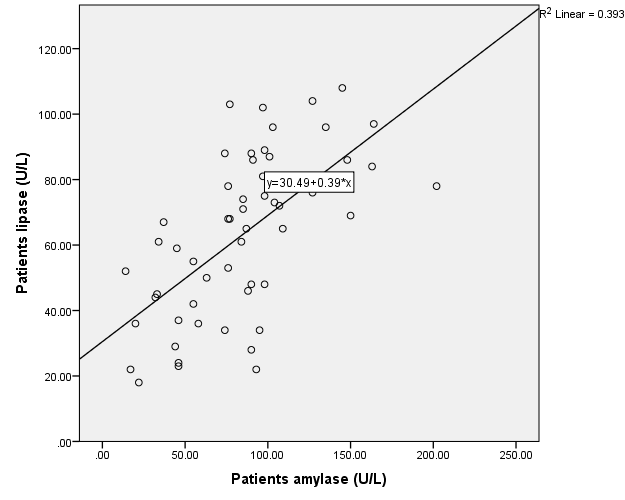 Moreover, correlation study results showed that even though the patients in this study had a significant increase in the median serum levels of lipase and amylase, none reached three times the upper limit of normal. The positive correlation between their serum levels (ρ = 0.627, p = 0.000) as shown in table 2, fig. 3. Suggesting that, instead of more involved and costly methods like imaging tests, measuring these enzymes is a quick and inexpensive way to rule out the development of acute pancreatitis complications.