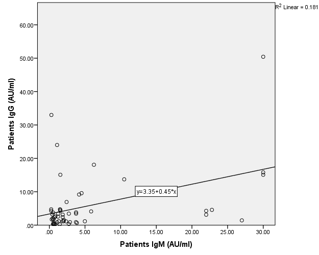 Fig. 6: Correlation of IgM with IgG in the patient’s group