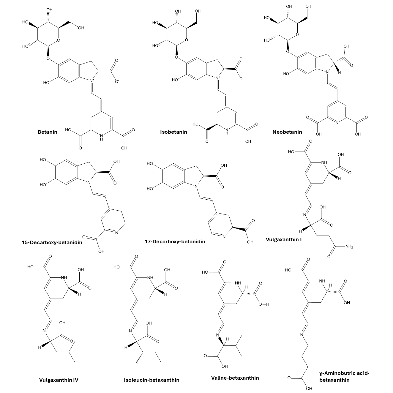 | Betanin (1) | Isobetanin (2) | Neobetanin (3) | 15-Decarboxybetanidin (4) | 17-Decarboxyisobetanidin (5) | Vulgaxanthin I (6) | Leucin betaxanthin_vulgaxanthin IV (7) | Valine-betaxanthin (8) | γ-Aminobutric acid-betaxanthin (9) | Isoleucin-betaxanthin (10) | |