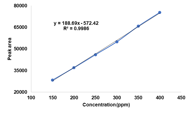 In this study, the quantification of betanin content was conducted using Waters’ ACQUITY UPLC System. Calibration curves were established from standard stock solutions of betanin, following the procedure reported by Rotich et al. (2022), with minor modifications [19]. The calibration was performed using betanin solutions at concentrations of 150, 200, 250, 300, 350, and 400 ppm prepared in MeOH/H₂O (1:1). Prior to analysis, samples were filtered through a 0.22 μM nylon syringe filter into Waters amber vials. The UPLC system was equipped with a PDA detector set at 534 nm and an ACQUITY UPLC BEH C18 column (130 Å, 1.7 µm, 2.1 × 50 mm). Analyses were carried out in triplicate under the following conditions: isocratic elution with acetonitrile (50%) and ammonium formate buffer (0.7 mmol) in water (50%) as the mobile phase, a flow rate of 0.4 ml/min, and an injection volume of 4 μL. The column temperature was maintained at 25 °C. Data acquisition and processing were performed using Empower 3 software.