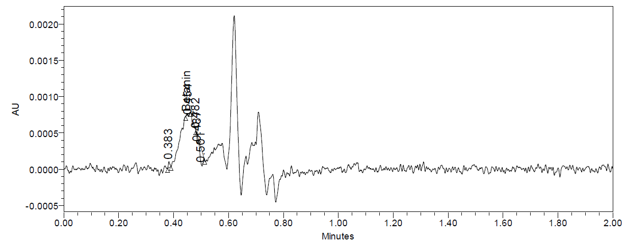 The UPLC chromatograms of betanin standards at concentrations of 150, 200, 250, 300, 350, and 400 ppm are shown in fig. 2 (a–f). The betanin was consistently detected at a retention time (Rt) of 0.44 min, with a maximum absorption wavelength in the range of 534-538 nm. These chromatographic profiles were used to construct the calibration curve (fig. 3), which enabled the quantification of betanin in beetroot extracts.