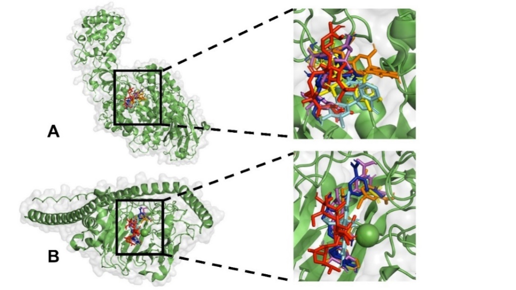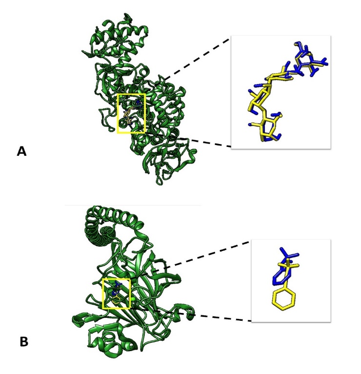 Fig. 5: Docking validation to compare the geometry of the native ligand (yellow) and docked native ligand (blue). A Glucosyltransferase and B Ag I/II