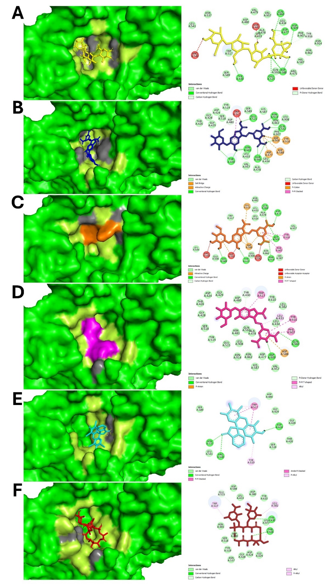 | 5 | Erythrosine | ASP424, GLU515, ASN537, ARG540 | THR426, GLY428, GLY429, ASP480, SER518, LEU541, SER589 | TRP517, TYR519 | |