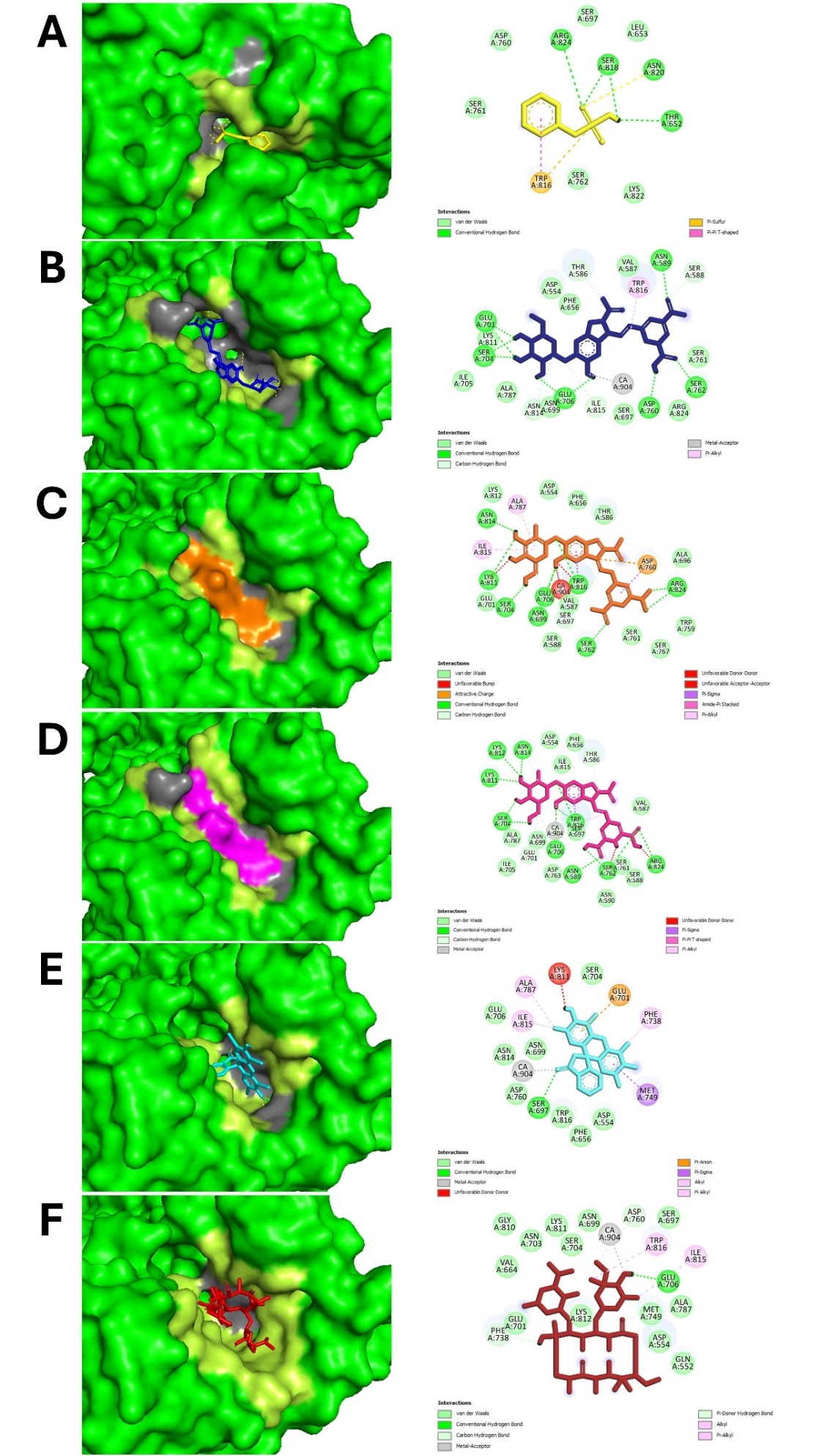 | 5 | Erythrosine | SER697 | ASP554, PHE656, ASN699, SER704, GLU706, ASP760, ASN814, TRP816 | GLU701 | PHE738, MET749, ALA787, ILE815 |