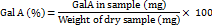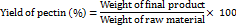 10 mg of the dried pectin sample was weighed, and 10 ml of 0.05 N NaOH was added to dissolve it. After allowing the solution to settle, 9.8 ml of purified water were added. After adding 1 ml of the carbazole reagent to 2 ml of this solution, a white precipitate was seen to form. After that, 12 ml of sulfuric acid were added while being continuously stirred. To develop color, the solution was left to stand for ten minutes. At 525 nm, the colorimetric measurement was made. In place of the carbazole reagent, 1 ml of 99% ethanol was added to the blank. The calibration graph plotted with galacturonic acid standard solutions was used to calculate the concentration of galacturonic acid [9].