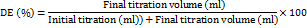 A 0.2 g sample of dried pectin was dissolved in 20 ml of distilled water after being moistened with ethanol. Until the pectin was completely dissolved, the sample was kept at 45 °C in a mechanical shaking water bath. The sample was mixed with three drops of phenolphthalein. The solution was titrated using sodium hydroxide at 0.1 N. As soon as some pink color started to show, the result was noted as the preliminary titration volume. The quantity of 0.1 N sodium hydroxide solution used for the first titration was used to determine the number of free carboxy groups. Then, to neutralize the polygalacturonic acid, 10 ml of 0.1 N sodium hydroxide were added. To de-esterify the pectin, the sample was sealed with a stopper, shaken vigorously, and then left to stand at room temperature for two hours [7]. The neutralized sodium hydroxide was mixed with 10 ml of 0.1 N hydrochloric acid, and the mixture was shaken until the pink hue vanished. After adding three drops of phenolphthalein, the sample was titrated once more using 0.1 N sodium hydroxide. After some pink coloration appeared, the titration volume was noted as the final titration volume. The amount of 0.1 N sodium hydroxide solution used for the final titration was used to determine the number of esterified carboxy groups [8].