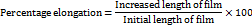 The initial and increased lengths of the OFDFs were used to calculate the film's percentage elongation. Using an Instron testing apparatus and a 50 kg weighed cell, the lengthened film was measured. Two clamps held each sample (2 x 2 cm²) firmly in a vertical position. After that, the top clamp held the films in place while the bottom clamp applied stress at a rate of 100 millimeters per minute. The formula below was used to determine the film's percentage elongation using the measured initial length and the length of the film following fracture [23].