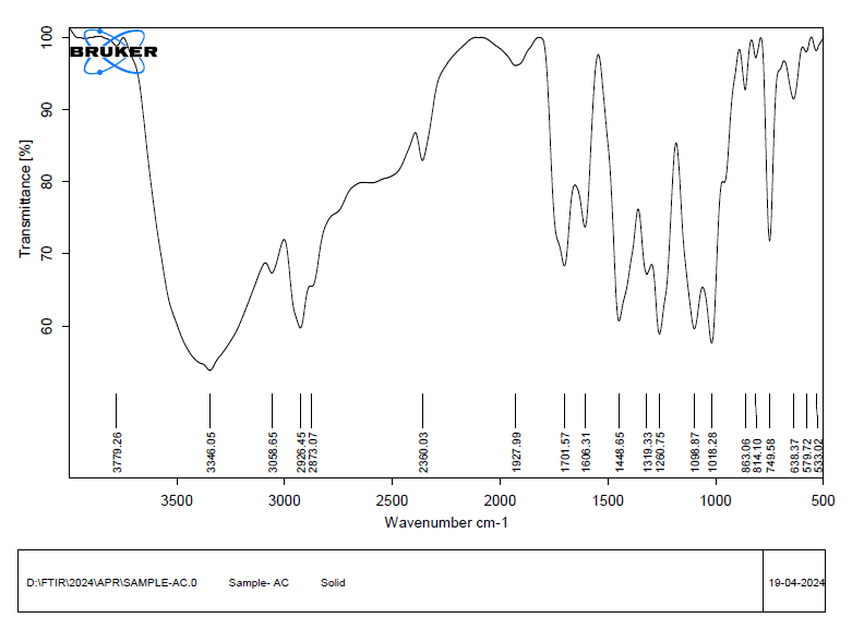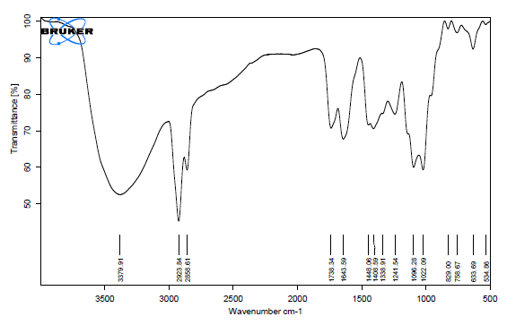 Using an FTIR spectrophotometer (M/s Bruker), the extracted muskmelon pectin's FT-IR spectra were captured in KBr disc over the 4000-400 cm-1 range. The findings are displayed in fig. 1.