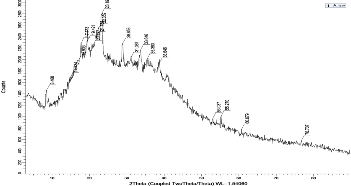 The extracted musk melon pectin was characterized in the solid-state using X-ray diffraction studies. Using Cu Kα radiation and a voltage of 40 kV, the X-ray diffractometer recorded the samples' diffraction pattern. The findings are shown in fig. 4 [17].