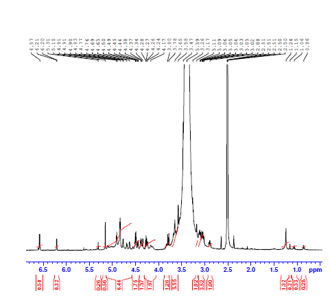 The pectin was dissolved in D2O, moved to an NMR tube, recorded at 400MHz frequency to obtain the ¹H NMR spectrum, and then looked for peaks that indicate the presence of sugar ring protons and methyl esters. The findings are displayed in fig. 5.