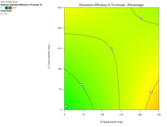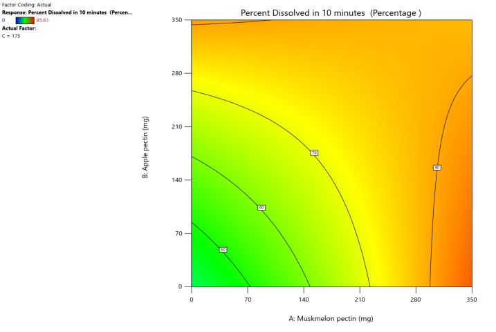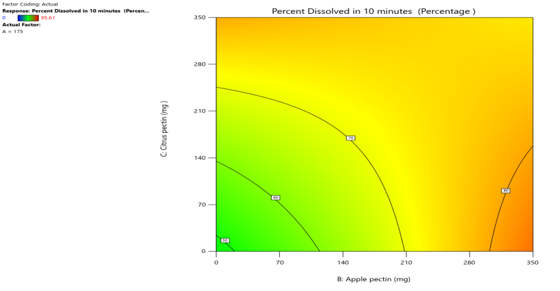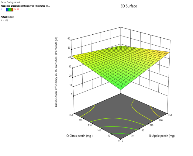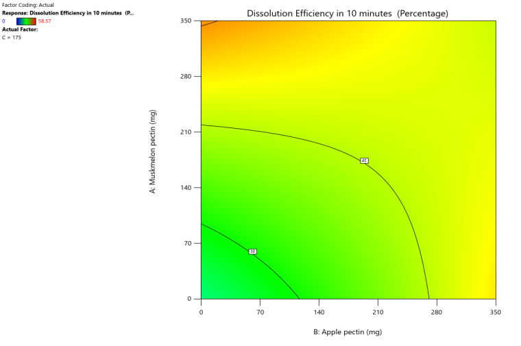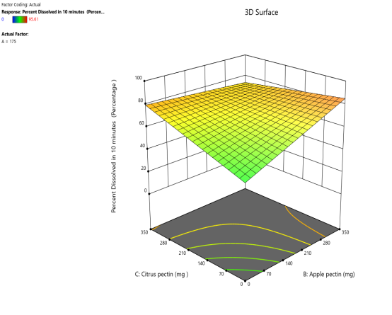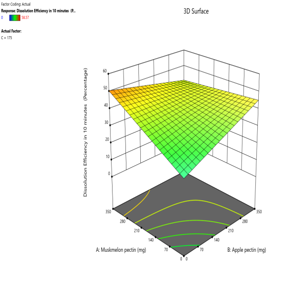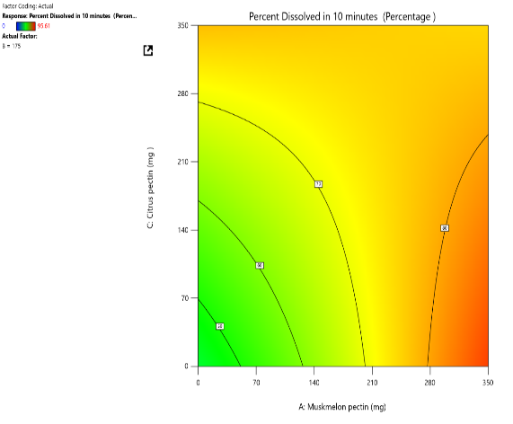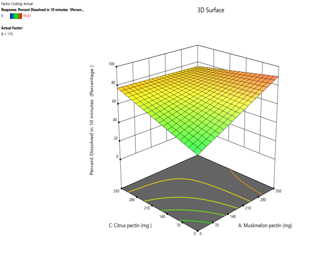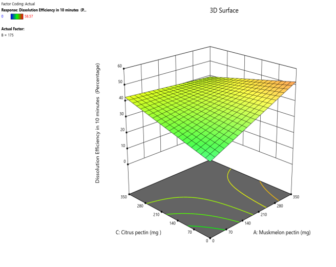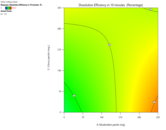 The 3D surface and contour plots reveal a significant and nearly linear positive effect of musk melon pectin (0–350 mg), apple pectin (0–350 mg), and citrus pectin (0–350 mg) on the percentage drug dissolution within 10 min and dissolution efficacy within 10 min. The percentage dissolved in 10 min (PD) dissolution efficacy (DE) in 10 min increases linearly with rising concentrations of musk melon, apple, and citrus pectins. Musk melon pectin (0–350 mg) shows a gradual PD increase, notably beyond 150 mg. Apple pectin (0–350 mg) exhibits a stronger linear effect, with significant dissolution enhancement above 210 mg. Citrus pectin contributes a steady increase in PD, becoming prominent at 140 mg or higher. A predictable rise in PD% and DE%is observed across all pectins, with values reaching above 90% when each exceeds 250 mg. The relationship is nearly linear within the studied range, confirming the concentration-dependent dissolution behavior. As the concentration of each pectin increases, the dissolution percentage and efficacy also increase, reaching up to approximately 95.61%. The plots demonstrate a synergistic effect where higher levels of two pectins simultaneously (especially musk melon with either apple or citrus) enhance dissolution more effectively. The gradient pattern and contour lines confirm the linear relationship across the tested range for each variable.