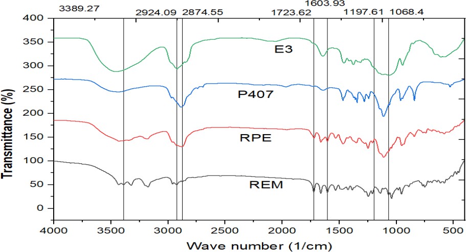 The FT-IR spectra of REM (pure drug), RPE (drug-loaded formulation), P407 (polymer), and E3(HPMC E3) provide valuable information about the chemical structure and potential interactions within the formulation. REM has distinct peaks at 3389.27 cm⁻¹ (O-H/N-H stretching), 2924.09 and 2874.55 cm⁻¹ (C-H stretching), 1723.62 cm⁻¹ (C=O stretching), and 1197.61 and 1068.4 cm⁻¹ (C-O-C/C-N stretching), indicating functional groups. These peaks are still present in the RPE spectrum, but with lower intensity and small shifts, indicating that REM may be hydrogen-bonding or dispersed molecularly within the formulation matrix. The P407 spectrum shows peaks associated with polyether structures, such as O-H stretching and C-O-C vibrations, but no indication of new chemical bond formation. In the E3 spectrum, identical peaks are retained with modest changes, particularly in the hydroxyl and carbonyl areas, showing non-covalent interactions such as hydrogen bonding between REM, P407, and excipients. The absence of new peaks across all spectra suggests that REM retains its chemical integrity, and there were no significant chemical interactions or degradation throughout formulation, showing high component compatibility.
