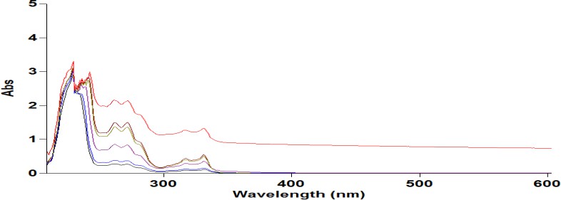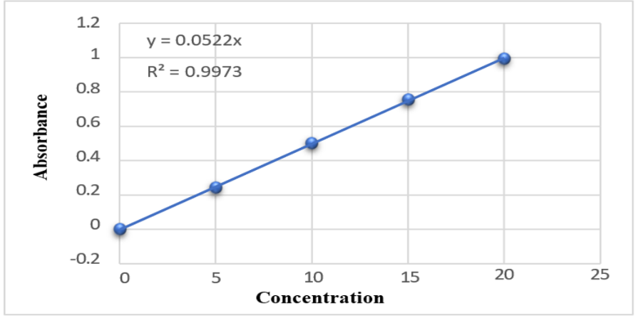 A REM solution was produced in distilled water and analysed for absorbance in the 200–800 nm range with a UV spectrophotometer (Agilent Technology, Cary 60). The highest absorbance was recorded at 247 nm, aligning with the documented USP peak illustrated in fig. 3. A standard plot for REM was produced utilising a UV-visible spectrophotometer at 247 nm, employing water as the blank, as illustrated in fig. 4 and 5. Absorbance measurements were conducted for values between 0 and 20 µg/ml. The regression coefficient (R²) was determined to be 0.9973.