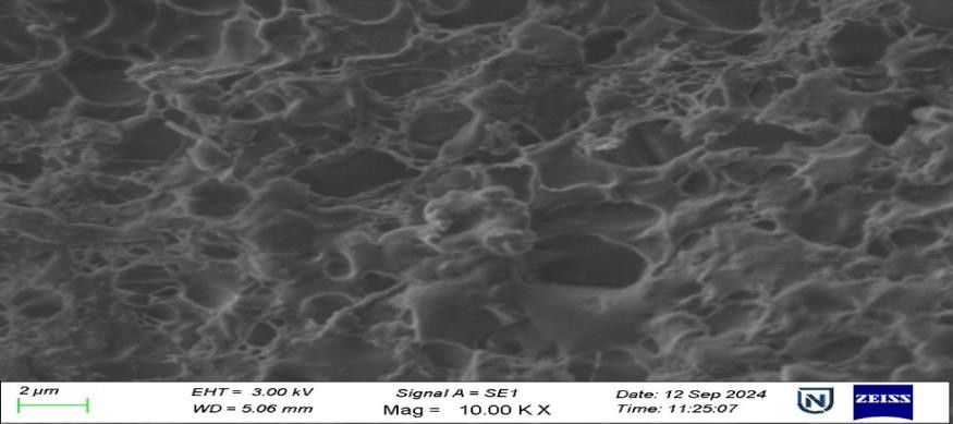 The SEM picture of the F4 formulation (fig. 9), taken at 10,000× magnification, displays a porous and interconnected surface morphology characterised by a sponge-like network. This structure signifies the successful creation of a NS matrix in which drug nanoparticles are likely incorporated within or adsorbed onto the carrier network. The existence of uniformly distributed pores and surface roughness indicates a substantial surface area, which can markedly improve the dissolving rate and bioavailability of weakly water-soluble pharmaceuticals such as REM. The lack of substantial crystalline formations suggests that the medication may exist in an amorphous or molecularly dispersed state, enhancing solubility. The image exhibits no indications of aggregation, suggesting excellent dispersion stability, probably due to optimised formulation conditions and the appropriate application of stabilisers. The SEM study substantiates that the F4 formulation exhibits an advantageous nanostructured architecture, enhancing its drug loading and release properties.