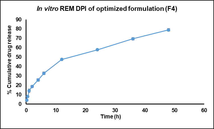Conclusion: The optimised REM nanoparticle formulation (F4) demonstrated favourable attributes for regulated pulmonary drug administration, featuring prolonged release and stable physicochemical features. These findings indicate significant industrial and therapeutic potential; nevertheless, additional clinical assessment is required to verify in vivo efficacy and safety.