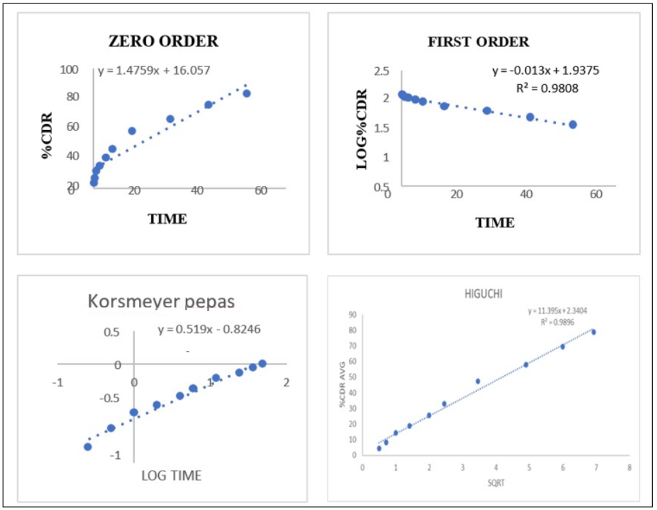 The in vitro release study of REM-loaded nanoparticles, particularly the F4 formulation, utilized a dialysis membrane with a molecular weight cut-off (MWCO) of 12–14 kDa to facilitate free drug diffusion while retaining the nanoparticle matrix. The release medium, phosphate-buffered saline (PBS, pH 7.4), was maintained at 50 ml to ensure sink conditions, exceeding three times the saturation solubility of REM (approximately 0.12 mg/ml) to prevent saturation effects. The release profile (fig. 12) exhibited a sustained and controlled release over 48 h, beginning with an initial release of 4.36±0.63% at 0.25 h, which increased to 14.25±4.94% at 1 hour, 32.85±2.48% at 6 h, 47.52±3.14% at 12 h, 57.84±2.52% at 24 h, and culminating at 78.96±0.49% at 48 h. The low standard deviations indicate the reproducibility and stability of the formulation. The biphasic release pattern, marked by an initial moderate release followed by a sustained phase, suggests a mechanism that involves both surface diffusion of loosely bound REM and prolonged release driven by polymer matrix erosion and diffusion. The analysis of release kinetics corroborates this finding, as the first-order model demonstrates the best fit (R² = 0.9808), suggesting a concentration-dependent release mechanism. The Higuchi model showed significant correlation (R² = 0.9396), suggesting a diffusion-controlled mechanism. In contrast, the Korsmeyer-Peppas model produced an n value of 0.519, indicating non-Fickian or anomalous transport that encompasses both diffusion and matrix erosion. The zero-order model exhibited a suboptimal fit, indicating that a constant release rate was not attained. The release behavior of the REM-loaded F4 NS indicates effective sustained drug delivery, potentially enhancing antiviral efficacy, reducing dosing frequency, and improving patient compliance relative to immediate-release formulations [30].