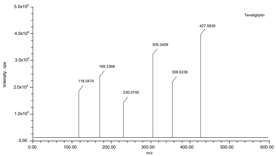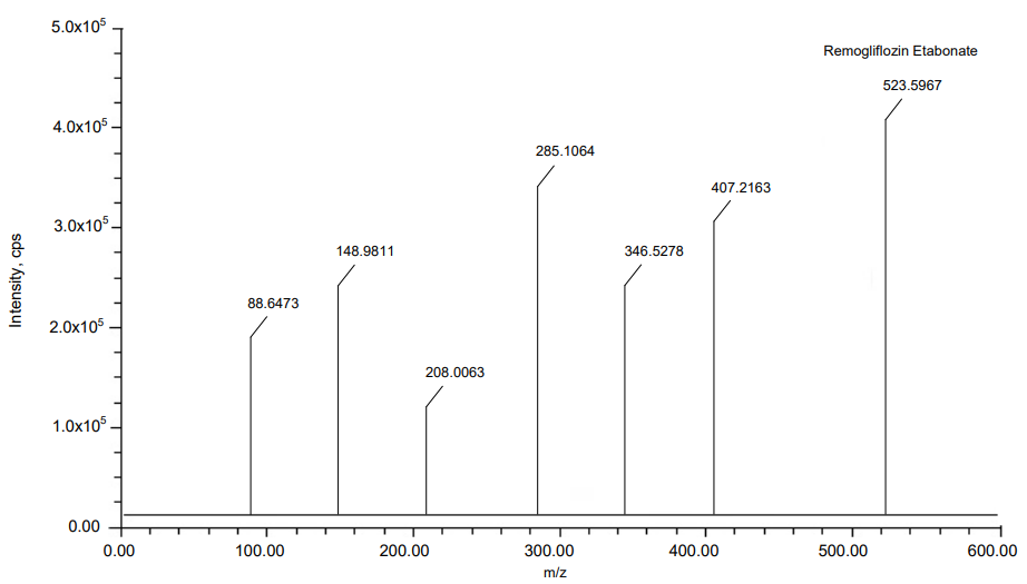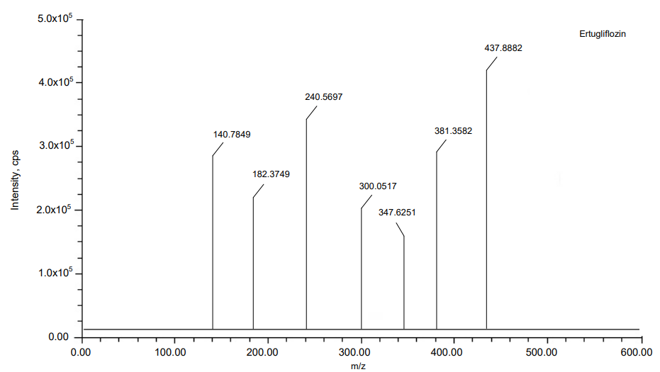 The MRM mode has been applied to Teneligliptin and Remogliflozin Etabonate to quantification of its ions. Ion pair scan of Teneligliptin and Remogliflozin Etabonate m/z 800.2 and m/z 745.4 formed major ions of [M+H]+at m/z 427.5839, m/z 305.2409 and m/z 523.5967, m/z 285.1064. In the same way, internal standard Ertugliflozin formed major ions of [M+H]+at m/z 437.8882, m/z 240.5697. Teneligliptin and Remogliflozin Etabonate give good positive ion response mode when resembling ion-negative mode. Fig. 1 show the details of the mass spectrum.