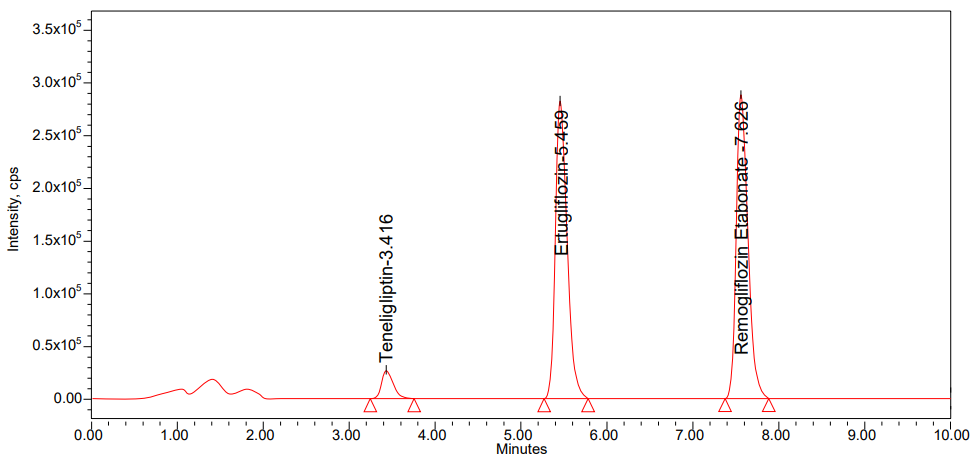 To acquire the best chromatographic conditions, we used different buffers with Acetonitrile as mobile phase in different ratios for isocratic, and gradient modes were tested. The mobile phase composition was modified at each trial to enhance the resolution and achieve acceptable retention times. Finally, 0.1% perchloric acid and Acetonitrile in isocratic mode at 70:30 v/v ratio was selected as a mobile phase because it gave a maximum response of the selected drugs. In the optimization method, we used different stationary phases like C18 and C8. From the different trials, we got good peak shapes of Teneligliptin and Remogliflozin Etabonate by using Zorbax SB C18 column of dimensions 250 mm x 4.6 mm, 5 μ connected to a PDA detector. Mobile phase flow rates were performed at 1 ml/min. By applying the above conditions, we got the retention times of Teneligliptin, Ertugliflozin and Remogliflozin Etabonate were 3.416 min, 5.459 min and 7.626 min, respectively. We get % CV of six replicate injections of Teneligliptin, Remogliflozin Etabonate were 1.63, 0.20; it indicates that the suggested strategy is very specific. The method under progress has been validated by following per USFDA guidelines [33, 34]. The system suitability results were shown in the following table 1.