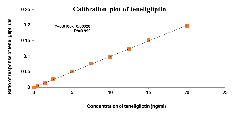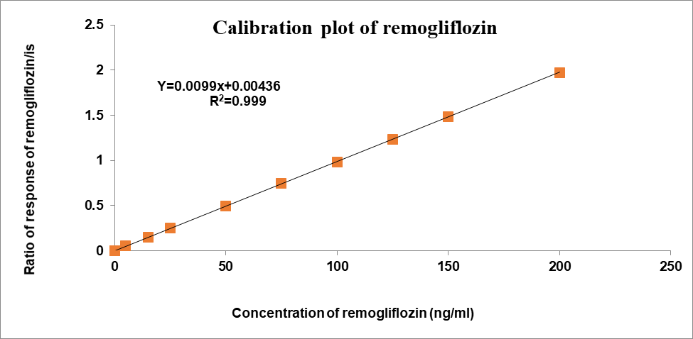 Concentration had a direct correlation with the peak area ratio of the standards used for calibration. Remogliflozin etabonate concentration ranges from 5-200 ng/ml and Teneligliptin have concentration ranges of 0.5-20 ng/ml using the least squares method. Table 2 shows the results of the linearity test for teneligliptin and remogliflozin etabonate, and fig. 4 shows the calibration plots for both drugs. Teneligliptin and remogliflozin etabonate both showed linear calibration curves with a correlation value of 0.999 [37].
